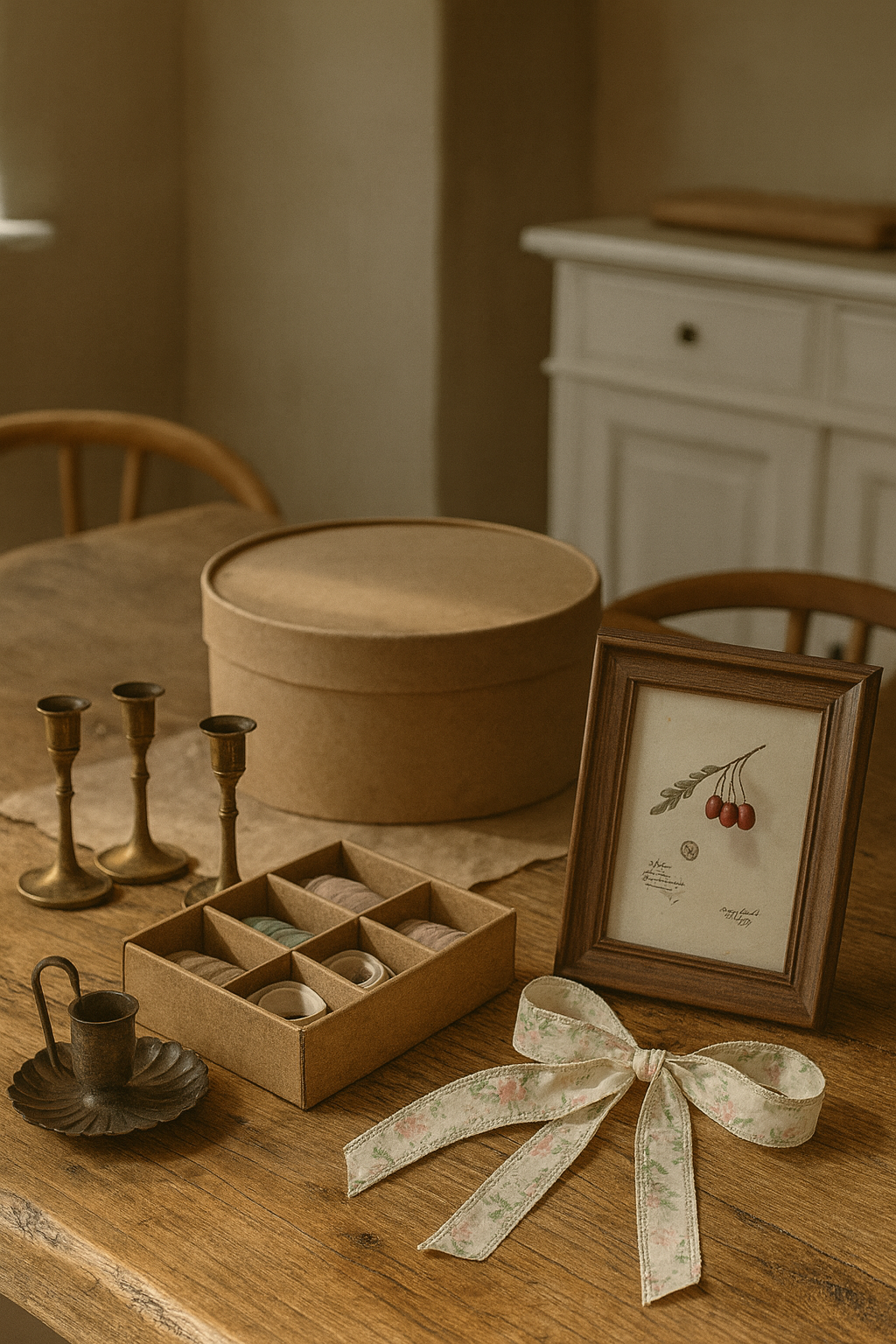 Panglici din catifea, hartie imprimata si accesorii delicate — pentru un cadou care aduce zambete. Inspirate din estetica vintage, fiecare detaliu spune o poveste calda si eleganta.